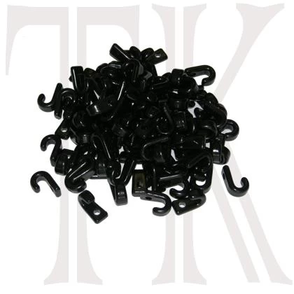 ONE HUNDRED, one hole Lashing Hooks (aka J-Hook) made of black nylon plastic, strong enough for all but the cruelest punishment. Sold in 10 packs and as singles also. Use for; seat back adjustment, paddle park, shock cord and deck lines. Hook end takes 1/4 in. shock cord. Hole end takes 3/16 in. shock cord when used as a seat hook. Fasten with number 10 screw or 3/16 in. dia. rivet.
