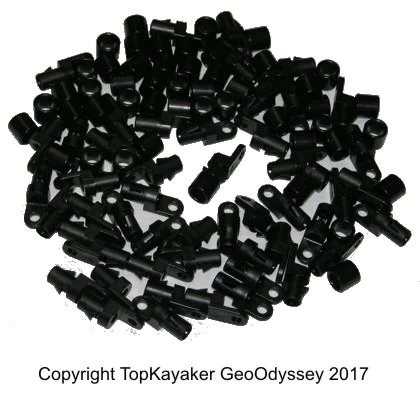 Common on side mount paddle holders. Use as replacements or for new custom work. Compatible with our Bungee Cord by the foot and most other shock cord used as kayak deck rigging. To assemble; Slip collar onto shock cord, slip terminal onto end of cord, slide collar onto terminal base, teeth will bite into bungee cord. Made of plastic. ITW Nexus. WSWH-BHW-BESR-50PK