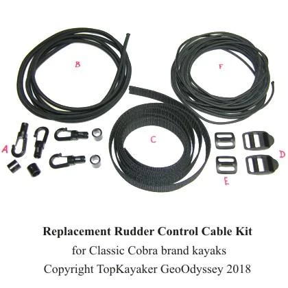This kit is to be used to replace the classic rudder control cables common on older Cobra brand kayaks of the 1990s and to some extent those kayaks made in the 21st century. Applicable to Cobra Tourer, Eliminator and Expedition kayaks. Might be used for some custom rudder systems on other brands of kayak.