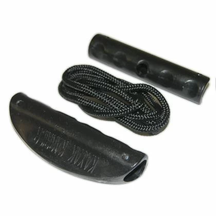 A common grab handle style for Wilderness Systems kayaks, with the words Kayak Karrier printed on the side. Found on many Perception Sport kayaks and other assorted brands of kayak. This handle is sometimes retractable with bungee cord and a deck fitting. Also known as Kayak Pull on a Sun Dolphin kayak. Handles are two black plastic tube grips with finger ridges and hole for light rope commonly to tie to a deck eye. Rope is included. Handle is four inches long, sold as a two handle kit. (alt 3290-0100.)