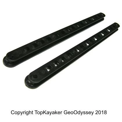 Keeper brand foot braces are very common and found on Perception kayaks, as well as other brands including Modern Wilderness Systems kayaks with rudders and thier sit-on-top kayaks. Keepers fit other brands of kayaks as well, including, older Necky, early model Old Town kayaks, Aquaterra, Islander and Dagger kayaks. This set is best used as replacement rails, or for parts when used in rudder foot controls. Please See the Keepers Foot Brace Kit for non rudder applications. If you want a copy of the instructions for that kit please ask using the comments box at check out.