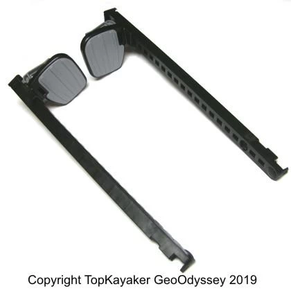 Common on Confluence brand sit-in-side kayaks (Wilderness Systems, Perception and Dagger) circa 2014 to date. Extra large foot pads provide greater comfort. Adjustable to fit any legs using the trigger on the back of the foot peg. 20.75 inches on total length. Screw holes for mounting are 14 5/8 inches on center. Kit comes with Right and Left braces, instructions and Mounting Hardware. Foot Pads are approximately 4×4 inches.