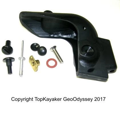 Prijon brand rudder bracket, best used as a replacement part, or for new use only on a Prijon brand kayak that is molded to take this type of gudgeon. The depth of the molding for the pin is 1 3/4 inches. Accepts a 1/4 inch diameter pin. Instructions are not included. The included mounting hardware may not be exactly as shown and may not exactly match older kayaks. It is assumed that the mounting hardware that does come with the kit is adequate for use on the majority of Prijon kayaks.