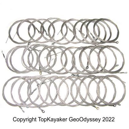 32 count Bulk Pack for Outfitters, Schools and Livery. This bulk pack contains thirty two 12 foot long stainless steel 1/16 in. diameter cables, aircraft quality, stainless steel, rudder cables long enough to be used on virtually all kayaks brands. Crimps and instructions are NOT included. Get the hundred pack of crimps to go with this bulk pack of cables as needed. Each cable has one eyelet 3/16 diameter. Tools needed: Rudder Cable Crimper Cutter Tool, or… Heavy-duty wire cutters and a large size Vice Grips will do just fine. Same cable type as Harmony part number 9820091.