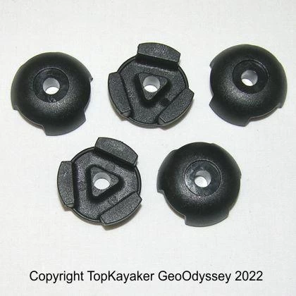 A Five Pack of round deck fittings common on some perception kayaks. Fittings hold ¼ inch deck rigging line, or bungee, running through the 3 holes around the perimeter. Part numbers 9820081, 9800483 and K4FAS070.